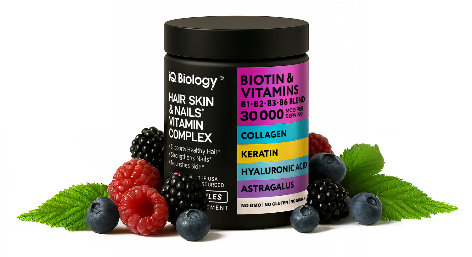 Biotin, collagen, keratin, vitamins A, C, D, E, and B-complex — plus three signature iQ Biology™ blends. A complete beauty formula to nourish healthy hair, skin, and nails.*
